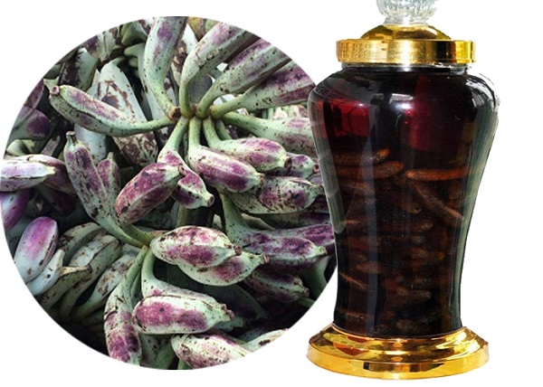 ⇒ Ngâm chuối hột rừng kết hợp với nấm ngọc cẩu: Nấm ngọc cẩu là dược liệu có vị chát và khá đắng, nếu ngâm rượu riêng sẽ rất khó uống. Người ta đã kết hợp nấm ngọc cẩu với chuối hột rừng, vị ngọt của chuối sẽ giúp rượu nấm ngọc cẩu dễ uống hơn giúp bổ thận tráng dương và tăng cường sinh lực phái mạnh.