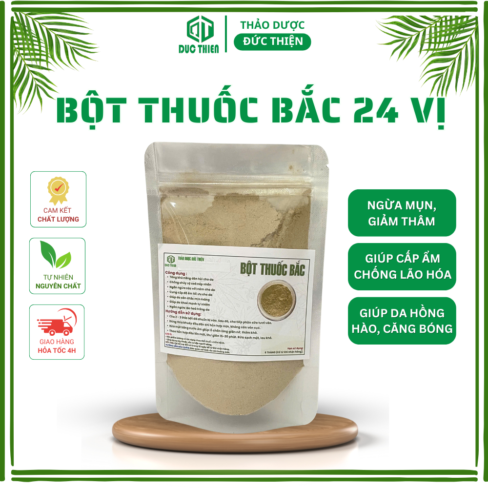 Bột thuốc Bắc 24 vị là sự kết hợp hoàn hảo của 24 loại dược liệu thiên nhiên quý hiếm, giúp làm trắng sáng da, mờ nám, chống lão hóa và cải thiện độ đàn hồi cho da một cách an toàn. Sản phẩm được sản xuất và đóng gói bởi Thảo Dược Đức Thiện – thương hiệu uy tín trong ngành dược liệu sạch.