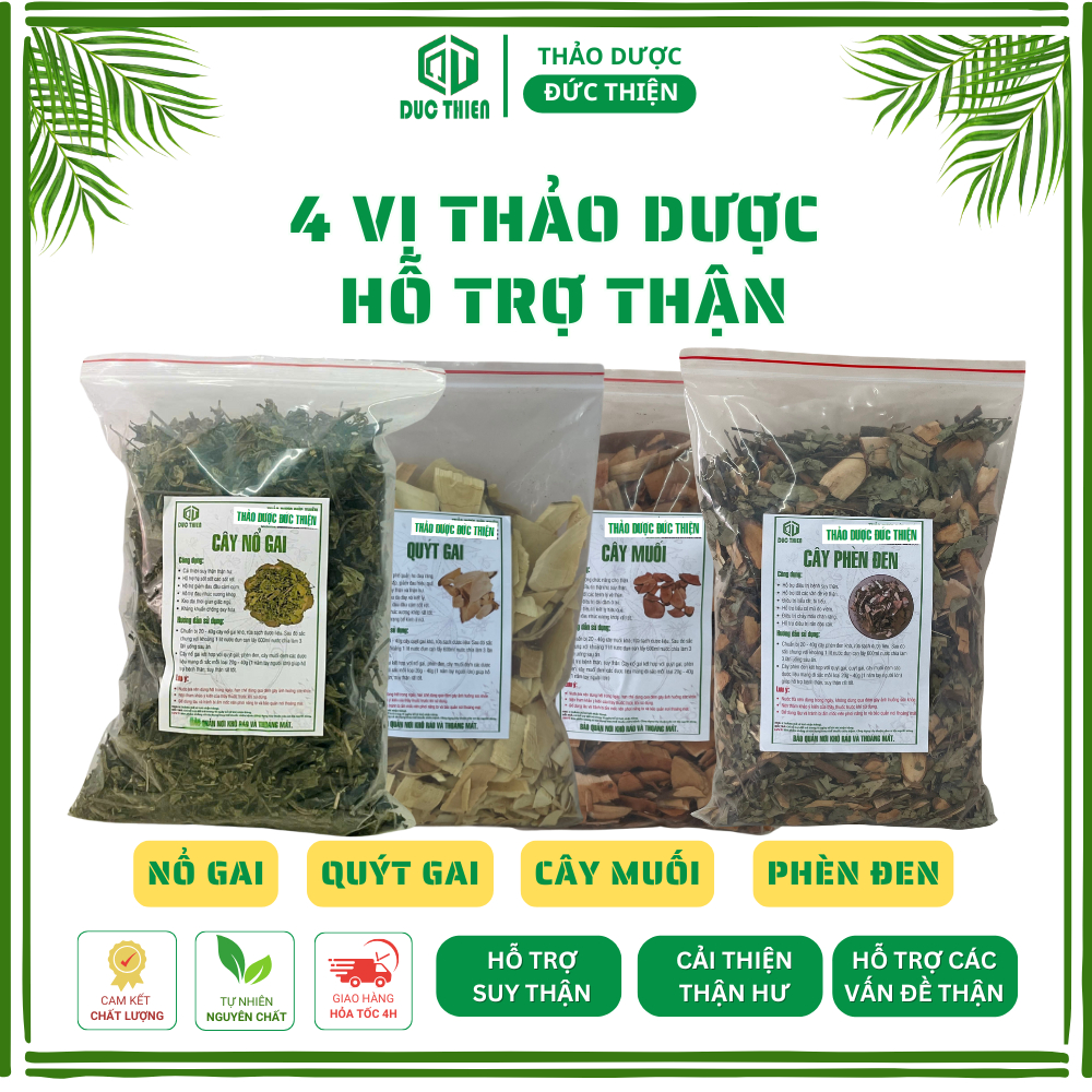 Combo gồm 4 vị thảo dược là: cây muối, quýt gai, phèn đen và nổ gai, đều là các vị thuốc dân gian có công dụng hỗ trợ điều trị các vấn đề về thận, tiết niệu, tiểu rắt, suy thận và thanh lọc cơ thể hiệu quả. Mỗi vị được đóng 500g, sử dụng độc lập hoặc kết hợp theo liệu trình.