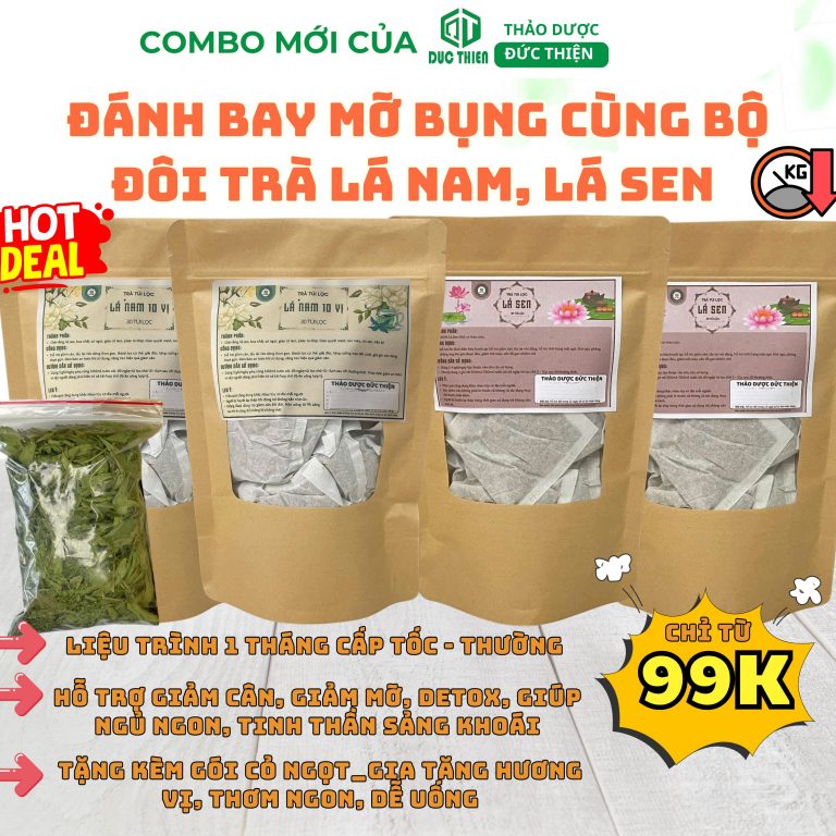 Combo bao gồm Trà Lá Sen và Trà Lá Nam 10 Vị – bộ đôi thảo mộc giúp giảm cân nhanh, thanh lọc cơ thể và hỗ trợ hệ tiêu hoá khỏe mạnh. Sản phẩm dành cho người muốn giảm mỡ an toàn, đặc biệt phù hợp với người ít vận động, dân văn phòng hoặc sau sinh.