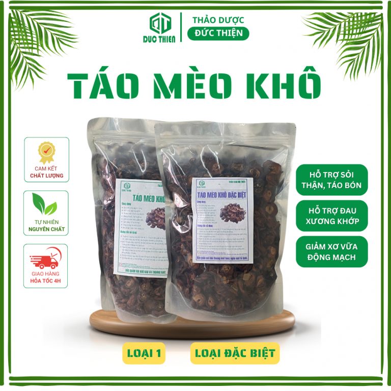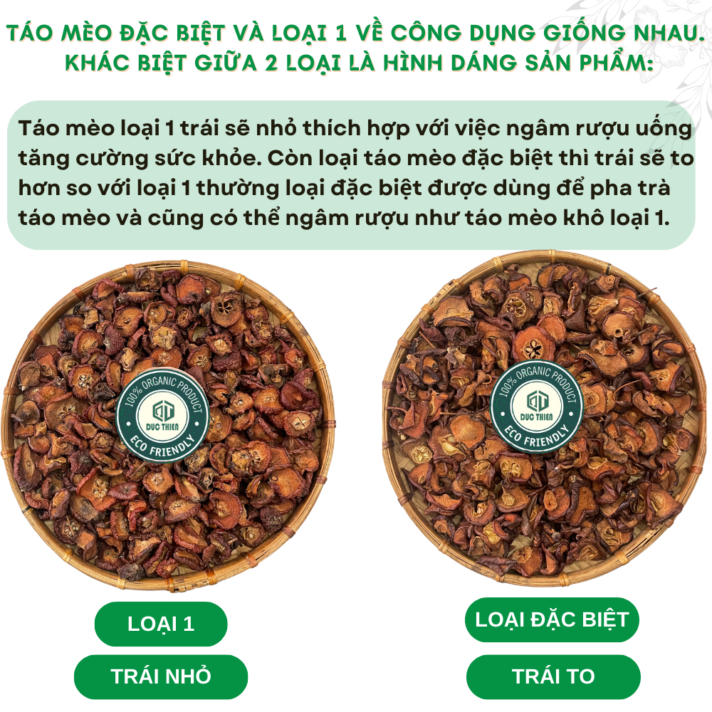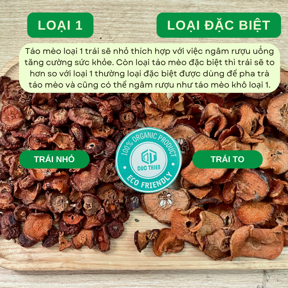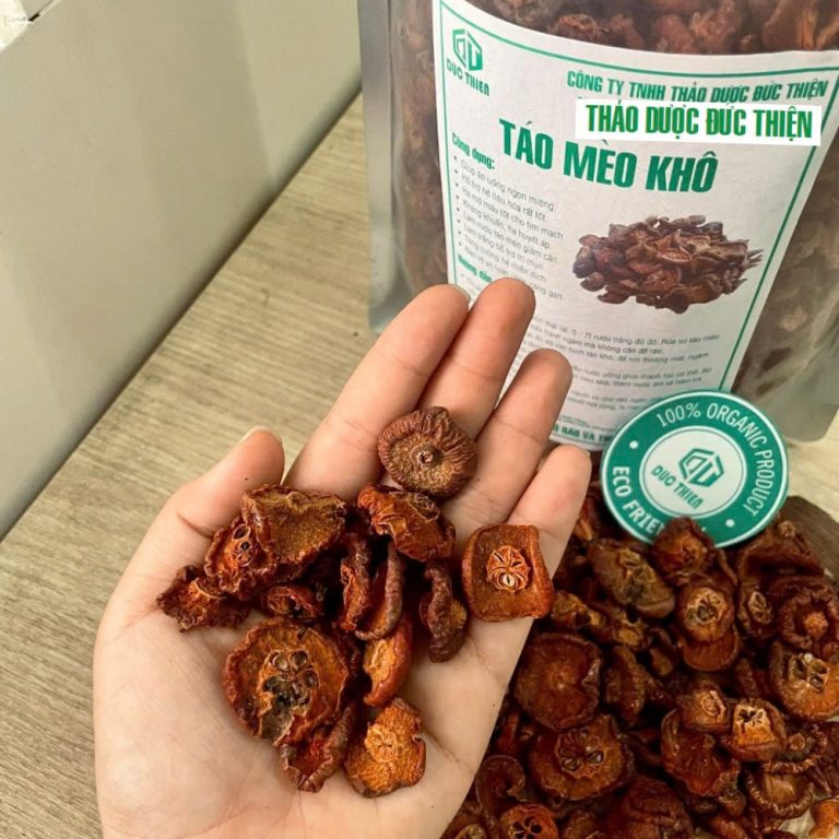 Táo mèo khô Đặc Biệt từ Thảo Dược Đức Thiện là loại thảo dược thiên nhiên quý, được sấy khô tự nhiên, bảo toàn dưỡng chất. Sản phẩm giúp hỗ trợ tiêu hóa, giảm cân, an thần và cải thiện huyết áp hiệu quả. Đặc biệt, táo mèo khô còn có thể dùng ngâm rượu hoặc kết hợp pha trà để chăm sóc sức khỏe toàn diện.